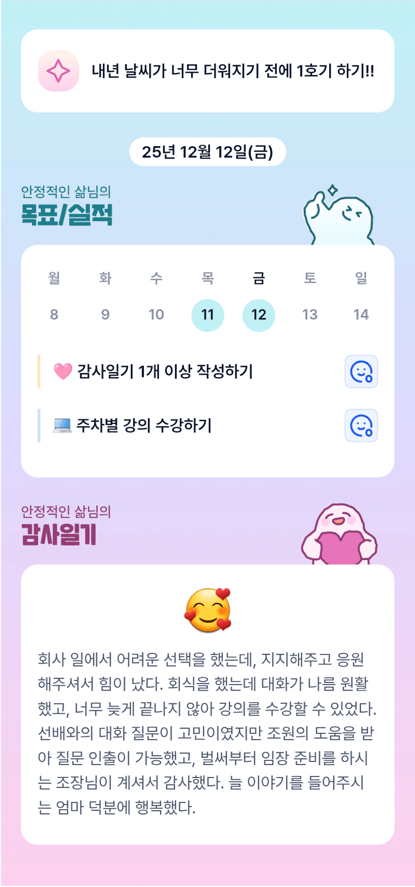 안정님~ 직장 회식, 강의 듣기, 질문지 제출 하나 하나 해나가시는 모습 멋져요^^ 회사에서 어려운 선택을 하셨고 하는데, 지지해주고 응원해주는 사람들이 계셔서 든든했을 거 같아요! 안정님~ 오늘도 충실하게 보낸 거 멋져요:)