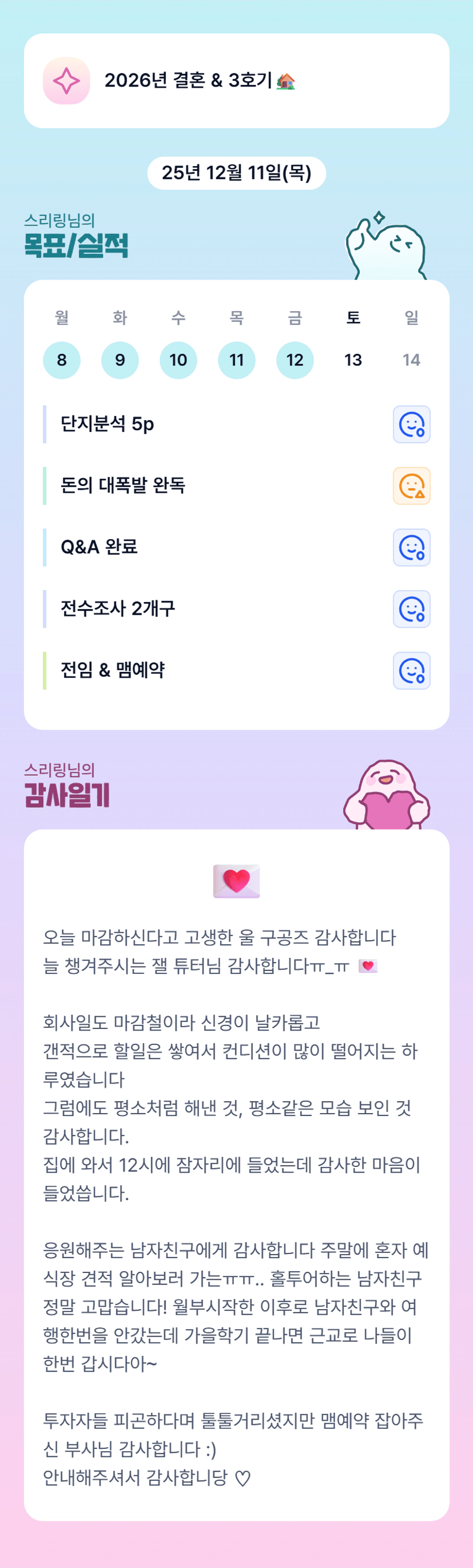 링 반장님 회사도 많이 바쁘셨군요ㅠ 컨디션은 좀 괜찮아지셨는지요.. 항상 열심히 하시는 모습보며 배우고 있습니다. 우리 반장님 빠이팅!!!!!!!!! 피드백도 감사드려요♡