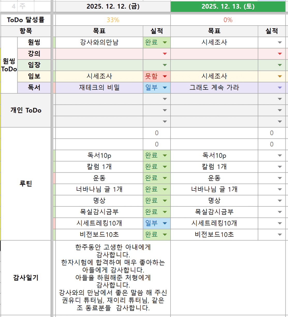 나는 건강한 사람이다.나는 부단히 노력하는 성실한 사람이다.나는 2025년 앞마당 10개를 만든다.나는 2026년 3호기 투자한다.나는 2028년 4호기 투자한다.나는 2030년 5호기 투자하고, 순자산 15억 달성한다.꾸준함은 성공의 최고 덕목이다. 나는 꾸준히해서 2035년 30억 부자가 된다.나 우가행은 해내는 사람이다.나는 한다.나는 해낸다.나는 반드시 된다.
