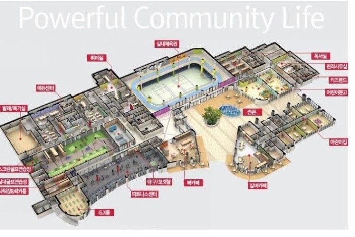 커뮤니티 시설(헬스장, 골프연습장, 수영장, 독서실 등)이