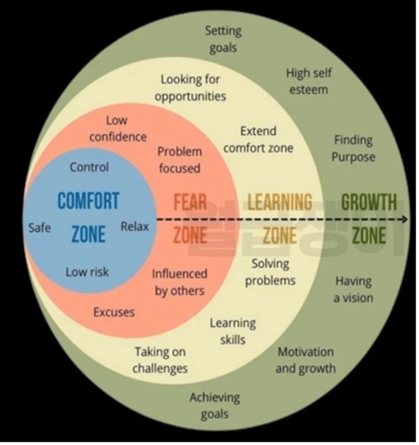 내 바운더리를 넘어 극도의 성장 지대로 가려면 목표 설정, 자존감과 자신감, 목표가 있어야 한다.