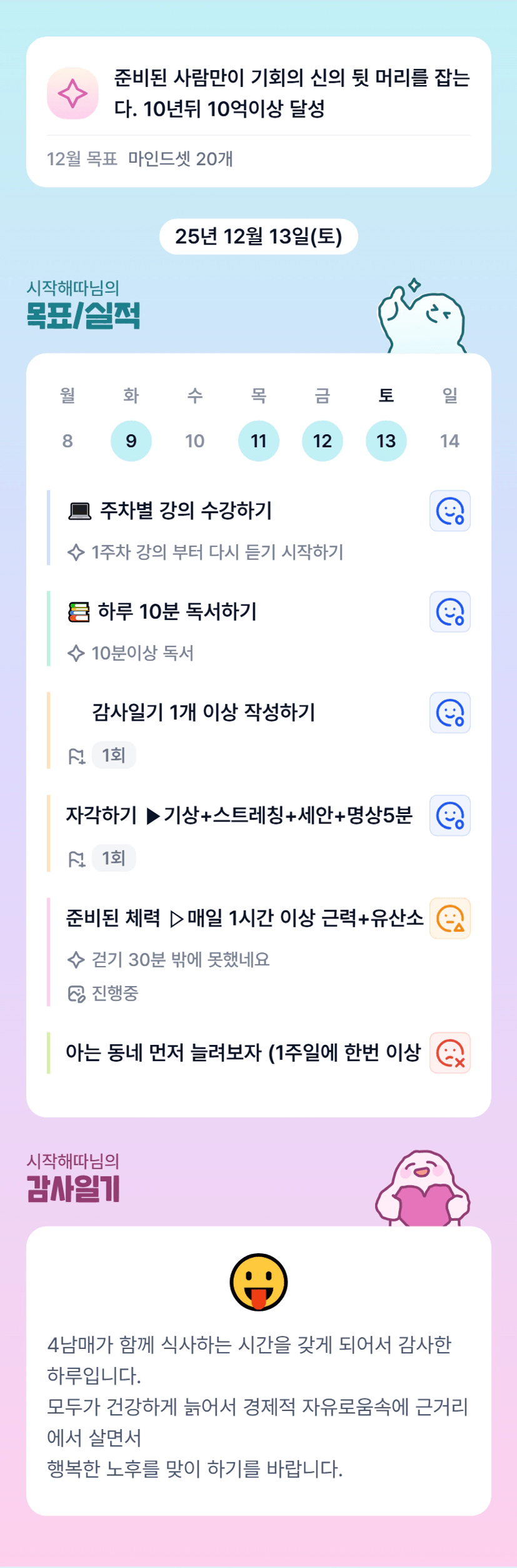 목실감 습관이 쌓여 루틴으로 정착하시길 바래요!! 고생하셨습니다 시작해따님 !!