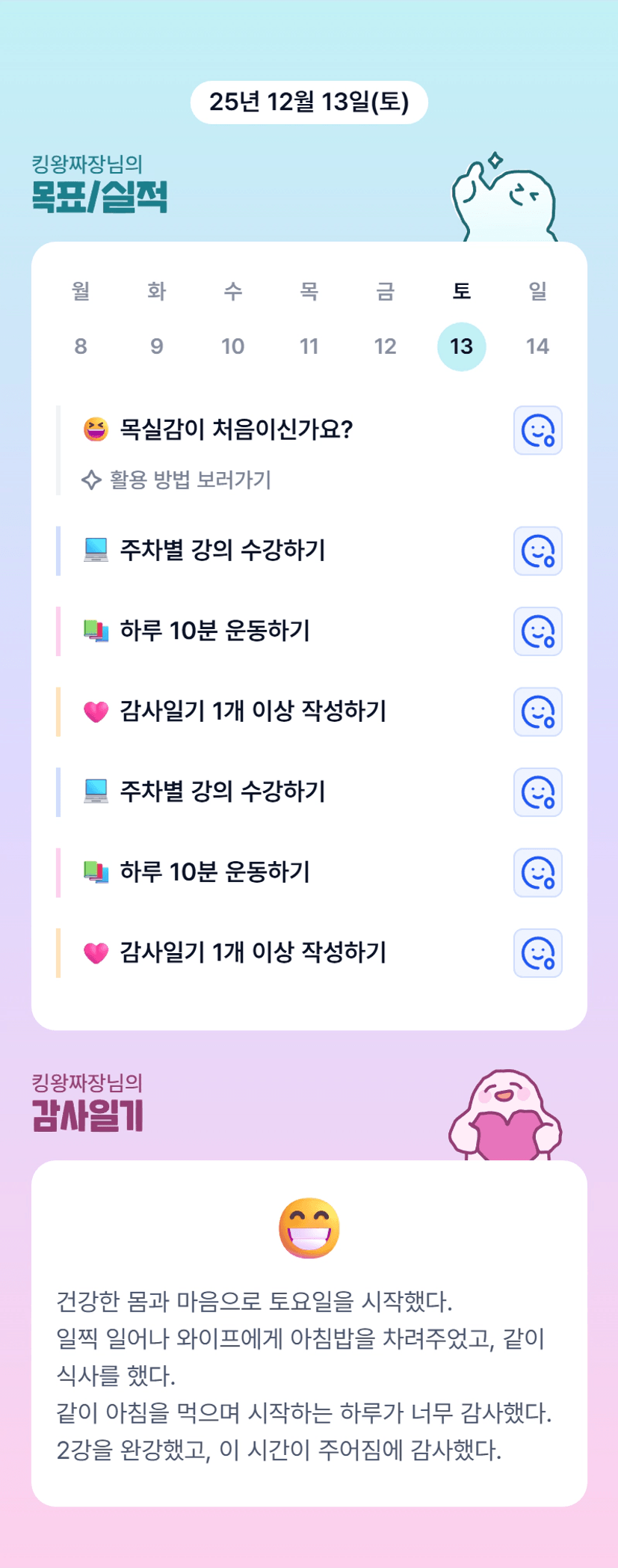 와! 킹왕님! 완강 축하드려요~ 와이프 식사도 차려주시고 이리저리 넘 멋지신거 아닙니까??? 강의들으시느라 고생하셨어요~ 과제도 화이팅!!!