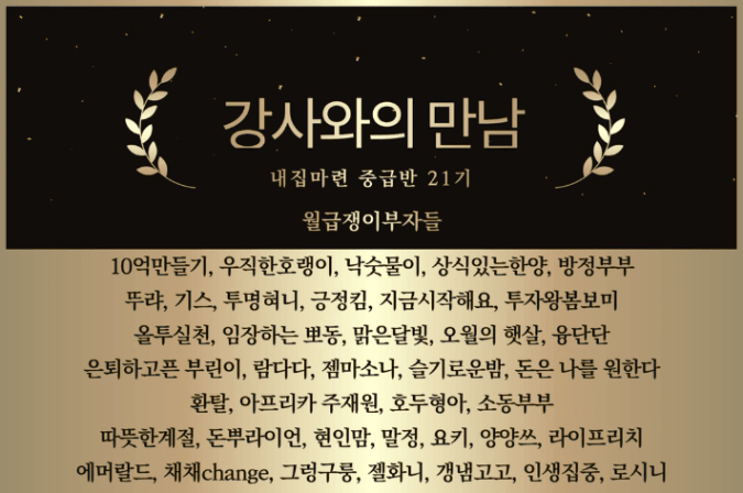 정말 센스있게 닉네임 지으신 상식있는 한양님, 결단력이 훌륭하신 라이프리치님, 55살전에 꼭 부자로 은퇴하셨으면 좋겠는 은퇴하고픈 부린이님, 내집마련 좋은 곳에 하셨으면 좋겠는 투자왕봄보미님, 최근 1호기 하신 람다다님, 부러운 매물코칭 받으실 돈뿌라이언님 너무 반가웠고, 월부 유니버스 안에서 계속 오래도록 뵈면 좋겠습니다.!