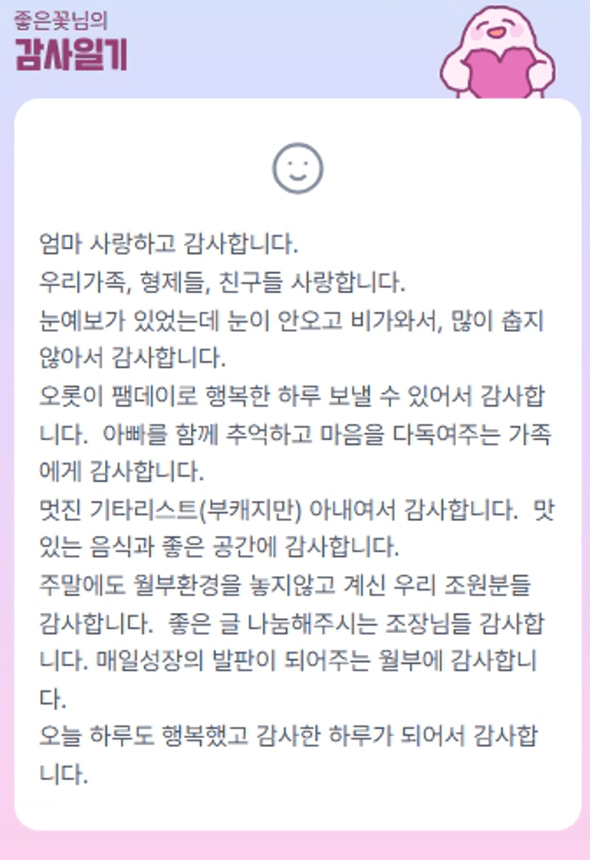 좋은꽃 조장님 기타리스트셨군요 ㅎㅎ 오늘도 너무 수고 많으셨습니다!! ^^