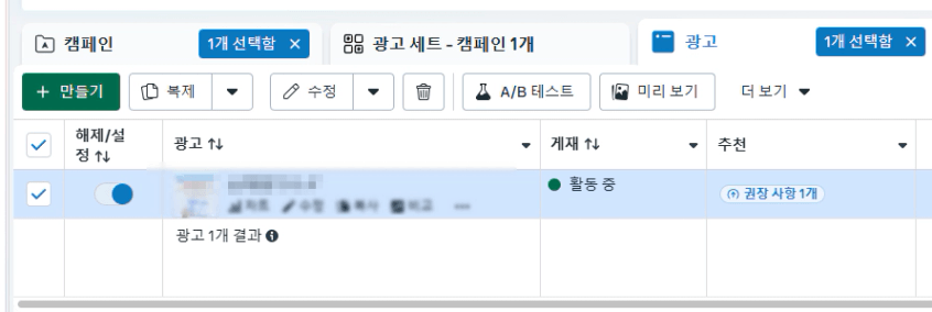 메타 광고관리자에서 아래와 같이 “활동중”으로 표기가 되는데요.