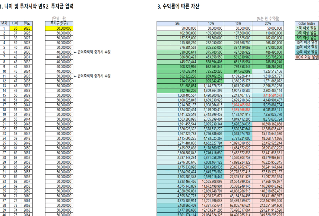 목표 금액 35억 (현재 나이 36세, 연저축액 5000만원에서 시작)