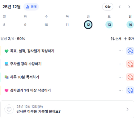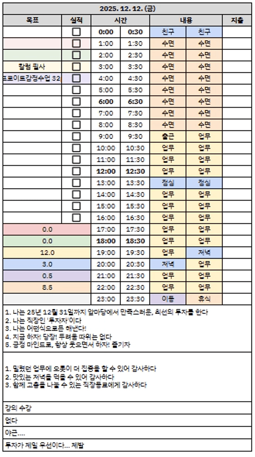 12/12 목표,실적,감사일기,시간가계부 [김실력]
