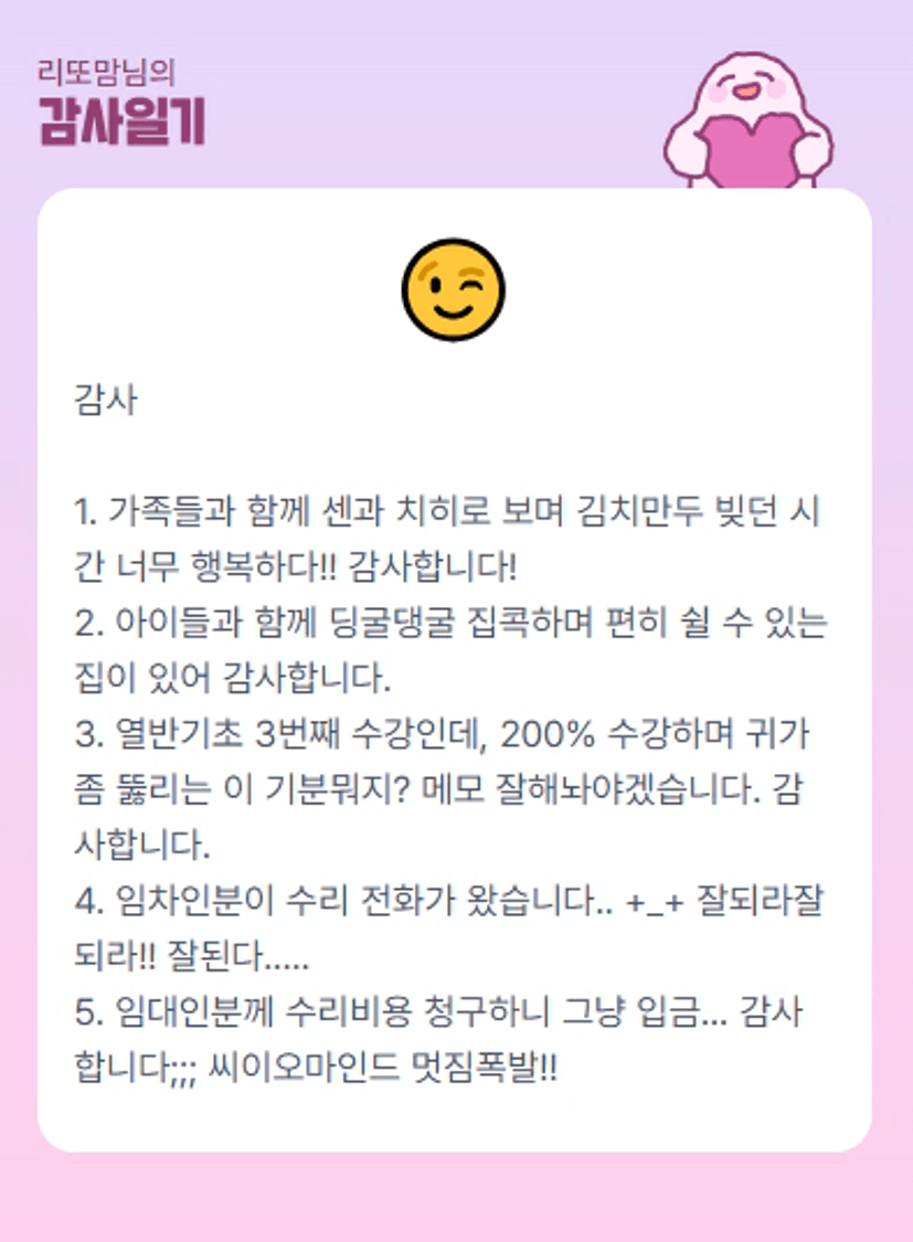 오 집에서 만두도 만들고 가족들이랑 도란도란 좋은시간이네용!😉 열기 벌써 3번째 들으시다니 들을때마다 다른게 들리나용 대단대단!