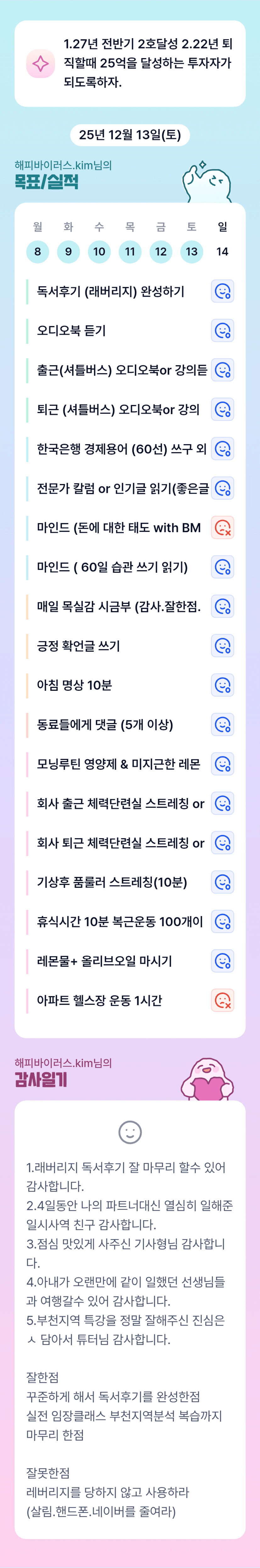 해피님 꾸준하심 너무 대단하세요. 엄청나게 많은 루틴을 생활속에서 다 해내시는 모습 아무나 따라할 수 없을 듯 하네요. ㅎㅎ 꾸준한 해피님 좋은 밤 되세요.