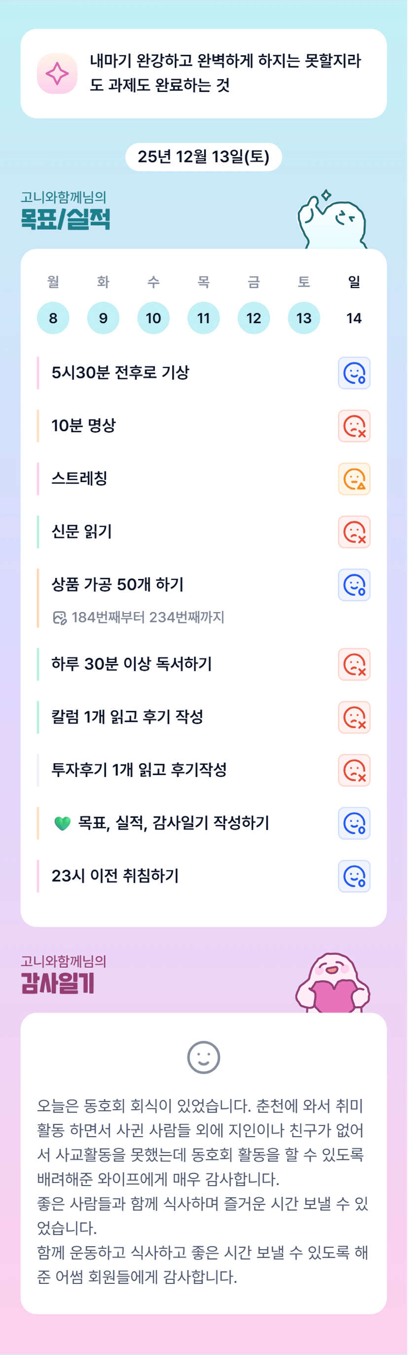 고니님 바쁜 하루 속에서도 목실감 작성하셨군요 ㅎㅎ 늘 톡방에서 정성스런 답변 해주셔서 감사드립니다 오늘도 화이팅입니다^^