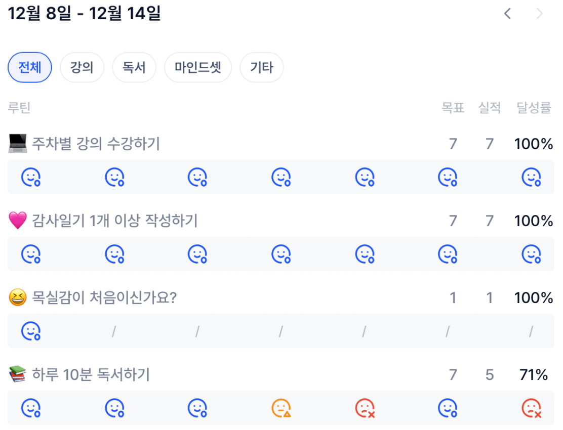 1️⃣ 목실감 - 통계 - 주간으로 들어가 이번주 나의 목실감 현황을 인증해주세요 ! :)