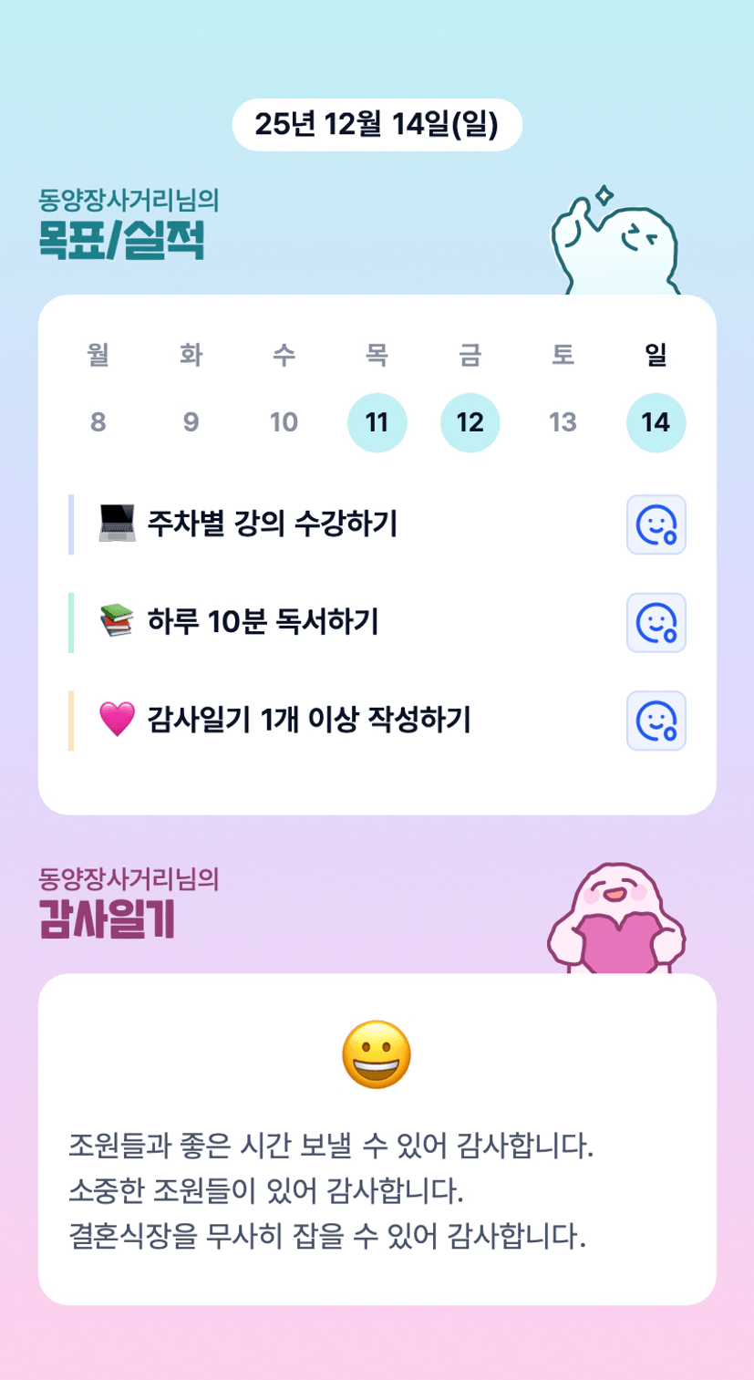 저도 사거리님과 2주차 조모임 겸 오프로 다시 만날수있어서 좋았습니다!! 12월 한달 끝까지 함께 해보아요!! 사거리님이 이번달 열기반에서 원하시고 목표하신 것 하나하나 모두 이뤄가시길 응원드립니다.