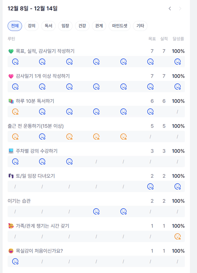한동안 down 되었던 나의 체력 및 마인드가 원래의 페이스대로 돌아오며 이번 한 주를 활기차게 보낼 수 있었다. 감사일기 조장을 맡은지라 솔선수범 하려 했고 감사일기는 목실감에 포함되어 있어서 보너스처럼 목실"을 챙겼다.