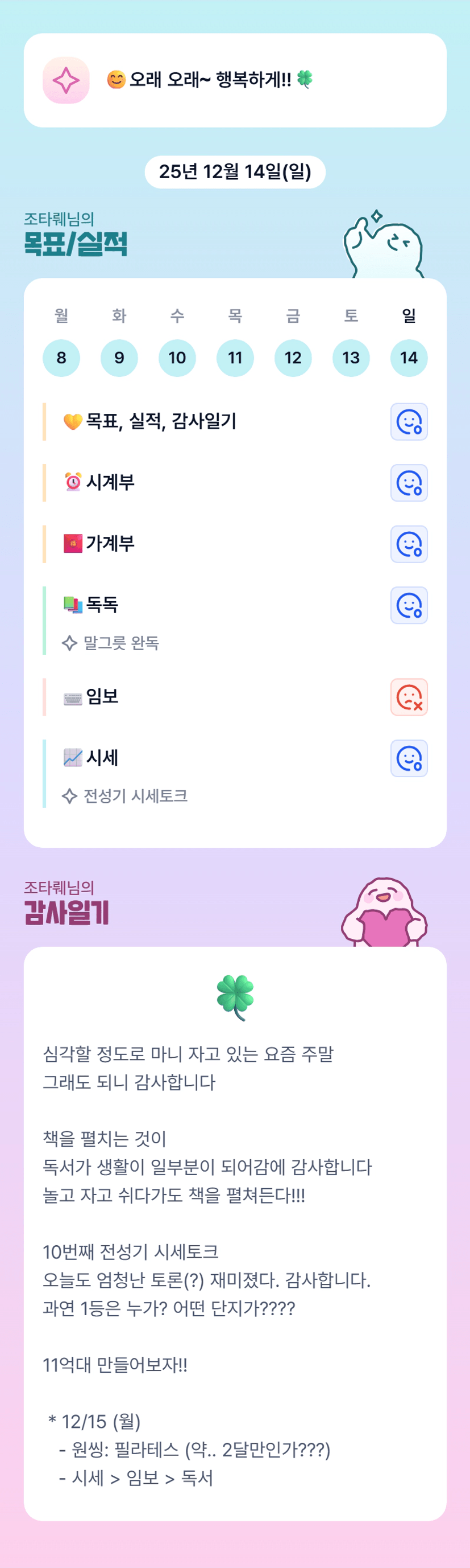 잠이 보약이에요~ 요즘 계속 야근하느라 많이 피곤하셨을거에요 나눠주신 시세토크방 임보 보면서 우와~했어요 늘 앞서가는 울조타님 멋지당👍👍
