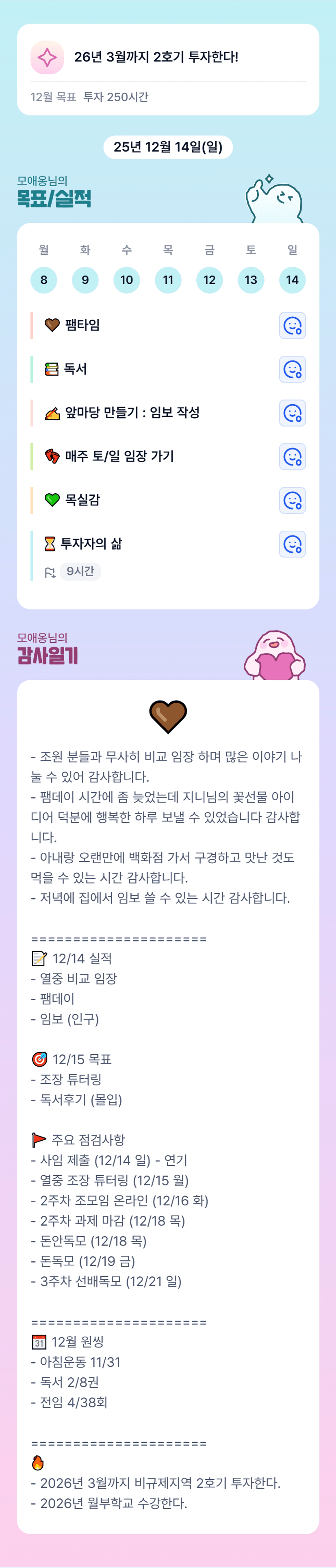 애옹님 오늘도 비교임장으로~ 펨데이로~~ 바쁘게 보냈네요~~~!!!!! 힘들지만 뿌듯뿌듯하실듯~~~ 애쓰셨어요~~~!!!!