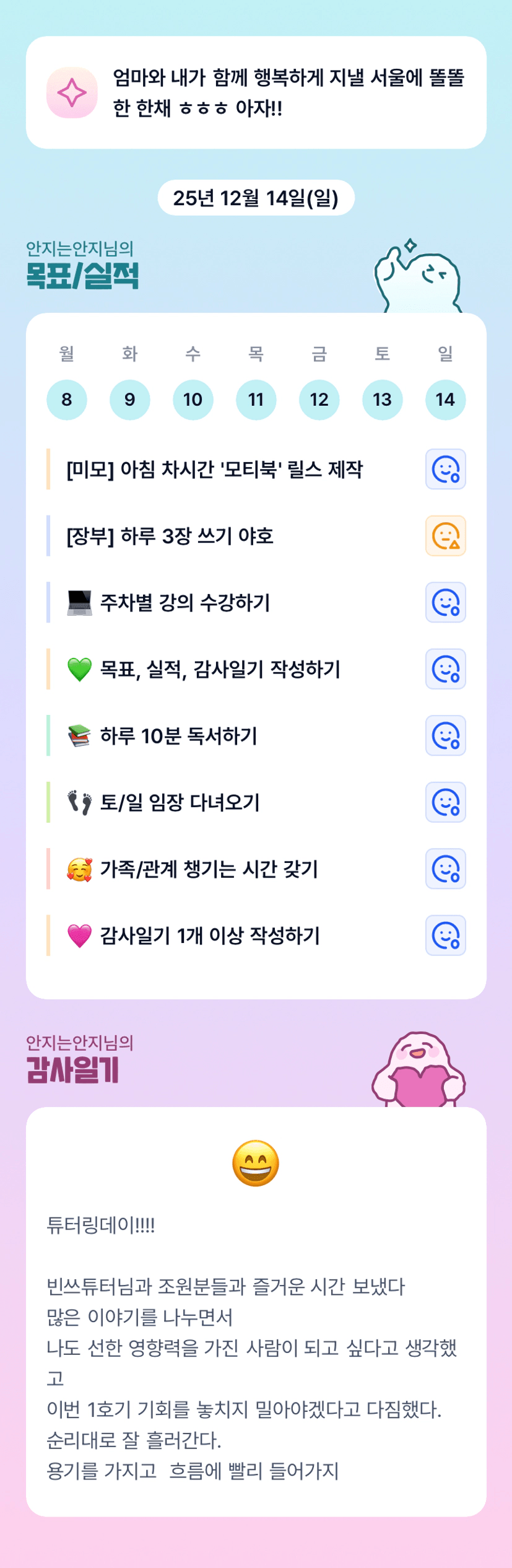 추후 튜터가 되실 안지는 안지님 응원합니다! 충분히 해내실 분💕 선한 영향력은 이미 있으셔요 🤗☺️