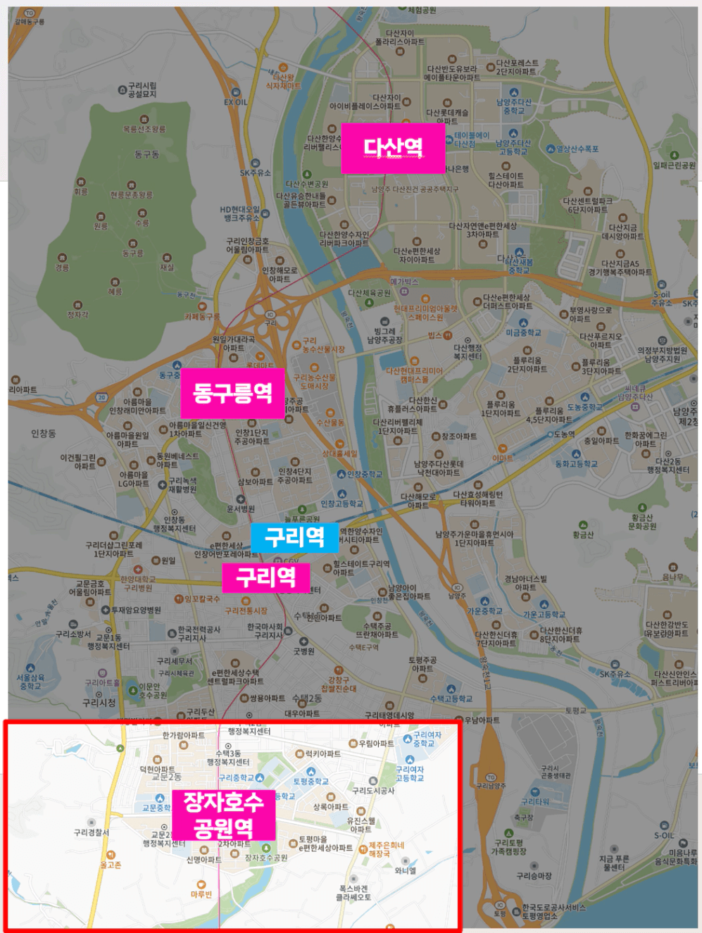 장자 생활권은 구리/남양주 전역에서 공부를 조금 한다 싶을 때 학원가를 보내는 나름의 학군지 역할을 했습니다. 아울러 사람들이 좋아하는 “물”을 많이 갖고 있습니다. 장자 생활권 안에는 호수공원이 있고 조금만 더 아래로 이동하면 한강이 있습니다.