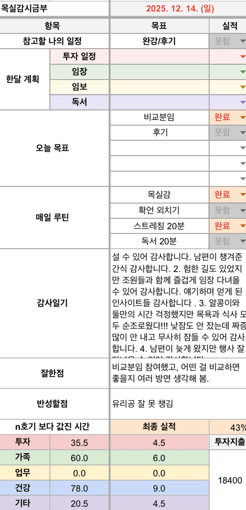 1. 아침일찍 스트레칭 하고 몸 풀고 나설 수 있어 감사합니다. 남편이 챙겨준 간식 감사합니다. 2. 험한 길도 있었지만 조원들과 함께 즐겁게 임장 다녀올 수 있어 감사합니다. 얘기하며 얻게 된 인사이트들 감사합니다 . 3. 알콩이와 둘만의 시간 걱정했지만 목욕과 식사 모두 순조로웠다!!! 낮잠도 안 잤는데 짜증 많이 안 내고 무사히 잠들 수 있어 감사합니다. 4. 남편이 늦게 왔지만 행사 잘 다녀올 수 있어 감사합니다.