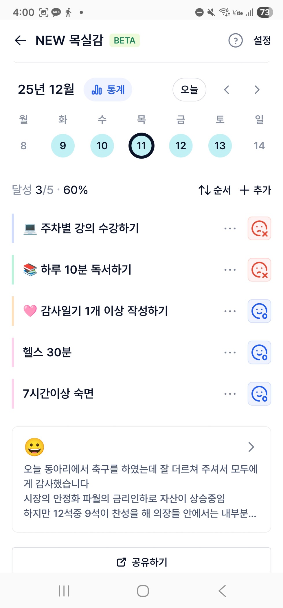기울님 목실감과제 고생많으셨습니다~ :) 참고로 아래 '공유하기'버튼을 누르면 감사일기 부분 잘리지 않고 이미지로 저장해서 업로드 가능합니다!