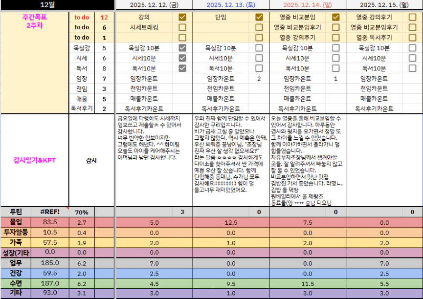 | 금요일에 다행히도 시세까지 임보쓰고 제출할ㅊ 수 있어서 감사합니다. 너무 빈약한 임보이지만 그럼에도 해냈다. ^^ 화이팅 오늘도 아이들 케어해주시는 어머님과 남편 감사합니다. | 우와 진짜 함께 단임할 수 있어서 감사한 구리입ㅈ니다. 비가 금새 그칠 줄 알았으나 그렇지 않았다. 역시 예측은 안돼. 우산 씌워준 꽁냥이님, "조장님 진짜 우산 살 생각 없으세요?" 라는 말씀 ㅎㅎㅎㅎ 감사하게도 다이소를 찾아주셔서 싼 가격에 예쁜 우산 잘 샀습니다. 함께 단임해줁 등대님, 슈가님 모두 감사해요!!!!!!!!!!!!!! 힘이 덜 들고너무 재미있었어요. | 오늘 열중을 통해 비교분임할 수 있어서 감사합니다. 하루동안 경사와 평지를 오가면서 정말 또 그 차이를 느낄 수 있었습니다. 함께 이야기하면서 올라가니 덜 힘들었습니다. 자유부자조장님께서 챙겨야할 곳들, 잘 알려주셔서 빼놓지 않고 잘 볼 수 있었습니다. 비교분임하면서 맛난 맛집 김밥집 가서 좋았습니다. 라몆ㄴ, 김밥 올 먹방 원베일리에서 울 제왕즈 동료들(앙 ㅠㅠ 숲님 디오님 ㅠㅠㅠㅠ) 볼 수 있어서 너무 감사한 시간이었고, 모애옹조장님도 너무 반가웠습니다. !!! 우리 거의 뭐 친정식구마냥 반가웠으나, 내색을 많이 못했음 ㅠㅠ 비교분임 끝나고 늦지 않게 신도림 결혼식장 도착할 수 있어서 감사했습니다. 올만에 보는 아부지, 그리고 고모 할머니 그리고 새신부 유진이 진짜 그간 본 신랑 신부 중 가장 예쁘고 멋진 신랑신부였음. 진짜 너무너무 예쁨 그리고 나도 살좀 빼야겠다는 타격감 받았음. ㅋㅋㅋ동기부여 !!!!! 오늘 몸살때문에 고생했는데도 결혼식장에 애들 델꼬 ㄷ와준 남편 감사하고 ㅠ 잘 못 챙겨줘서 미안하고. 완전 풀수면 감사합니다. |