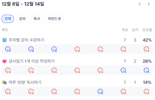 1주차는 기본적인 목표만 체크 처리 하고 있었는데 이번 2주차(12.15.~12.21.)는 새로운 목표를 추가하여 매일 조금씩 실천해봐야겠다.