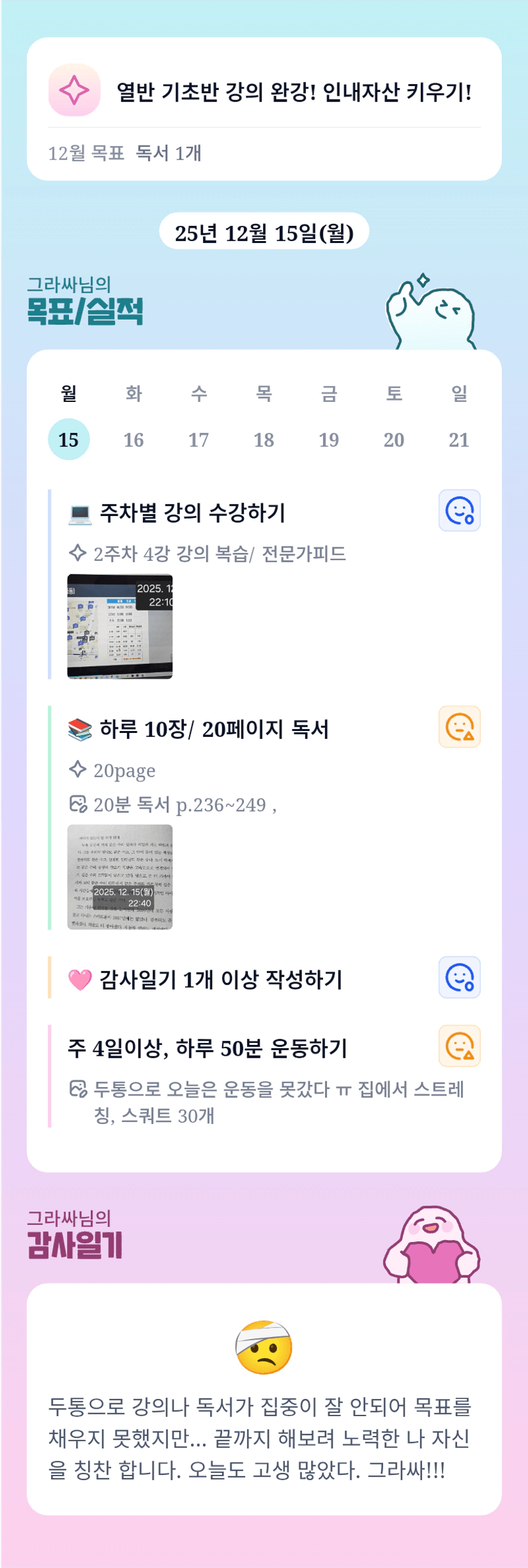 독서 꾸준히 하고 계시네요 그라싸님~ 건강도 중요하니 힘들때는 조금 쉬어 가셔요^^