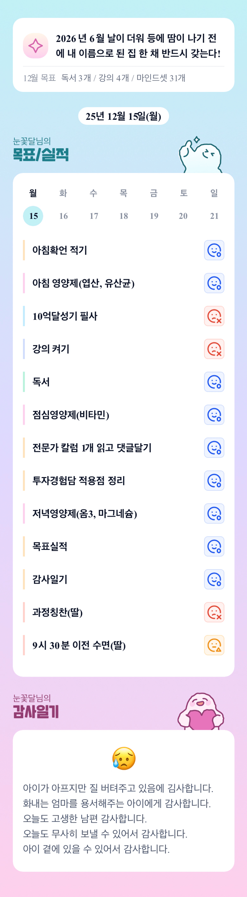 아이쿠 이쁜 아이가 얼른 낫기를 바랄께요. 미라클모닝의 여왕 눈꽃달님 화이팅!