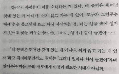 앞으로는 타고났다라는 생각이 들 때 보이지 않았던 노력과 시간을 먼저 떠올려보려 합니다. 또 제 자신에 대해서도 할 수 없다고 스스로 한계를 긋지 않꼬 지금 내가 더 노력할 수 있는 부분은 무엇인지 구체적으로 질문하는 연습을 해보겠습니다.
