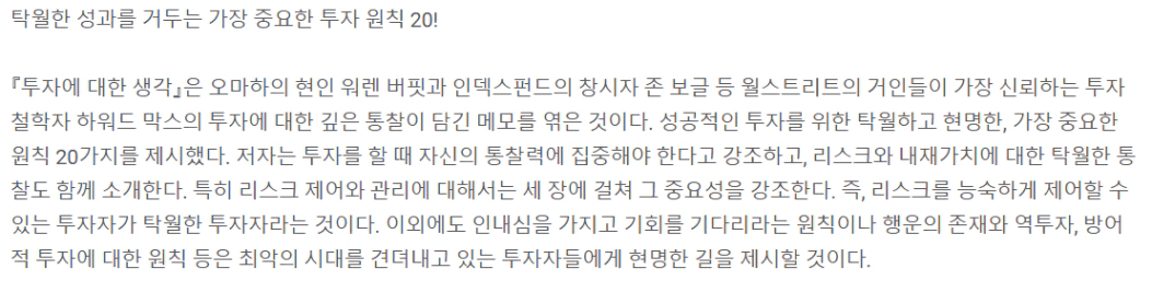 책 제목(책 제목 + 저자) :투자에 대한 생각 + 하워드 막스