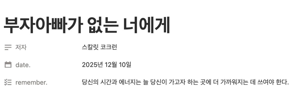 이 책을 읽으면서 가장 크게 남은 건, 저자는 처음부터 안정적인 환경에서 출발한 사람이 아니라는 점이었다. 그 힘든 생활고 속에서도 오히려 그 현실을 회피하지 않고 정면으로 바라봤다는 것. 그리고 그 과정에서 두려움 자체를 없애려고 하지 않고, 두려움을 해석하는 방식을 바꿨다는 점이 유독 인상 깊었다.