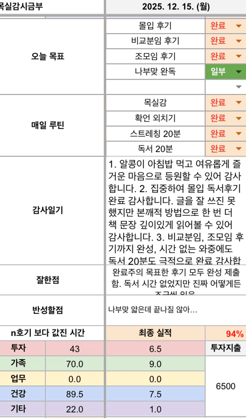 1. 알콩이 아침밥 먹고 여유롭게 즐거운 마음으로 등원할 수 있어 감사합니다. 2. 집중하여 몰입 독서후기 완료 감사합니다. 글을 잘 쓰진 못했지만 본깨적 방법으로 한 번 더 책 문장 깊이있게 읽어볼 수 있어 감사합니다. 3. 비교분임, 조모임 후기까지 완성, 시간 없는 와중에도 독서 20분도 극적으로 완료 감사합니다. 4. 부동산 거절 문자로 마음이 한결 가벼워지고 , 매물 정리 글을 쓰니 내가 할 일을 한 것 같아 조금은 무거운 기분 덜어낼 수 있어 감사합니다. 이런 행동들을 하면 무게를 덜어낼 수 있는 경험을 할 수 있다는 걸 깨달아 감사합니다. 5. 알콩이의 주장이 강해져서 정수기 방문 시간 약속 못 지켜 당황했는데 일정 챙겨서 집에 있어 준 남편 고마워요. 나는 힘들었지만 알콩이는 케이크와 쥬스로 만족한 시간 보냈다…!! 집에서도 함께 노래 부르고 춤추면서 즐겁게 시간 보내 감사합니다. 6.머리말리며 틈독 감사합니다.