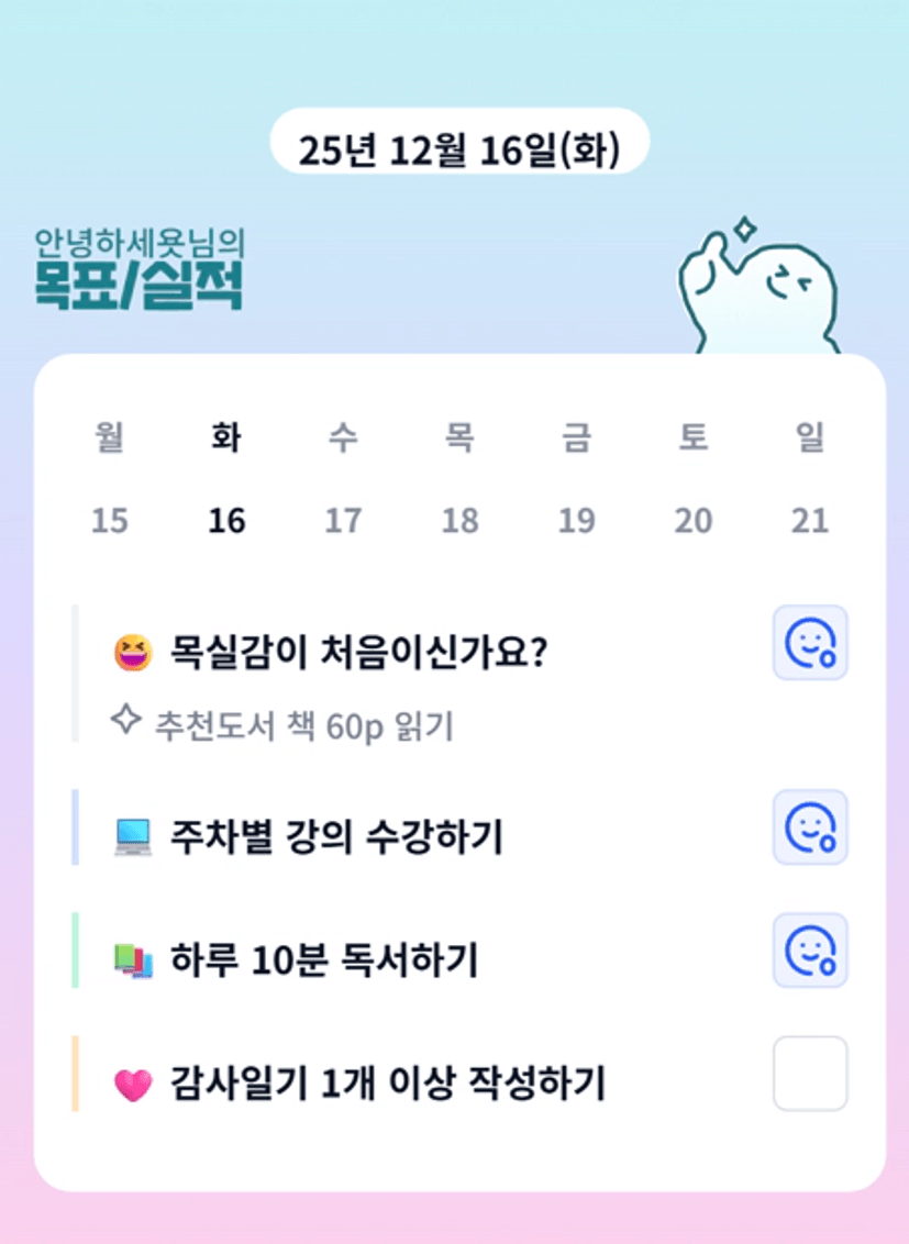 하루에 감사한 일을 머릿속으로 새기는 건 되는데, 일기를 작성하는 건 왜 어려운 것일까 … 앞으로 감사를 생각만 하지말고 일기로 꾸준히 작성해 나가는 태도를 가져봐야겠다 …