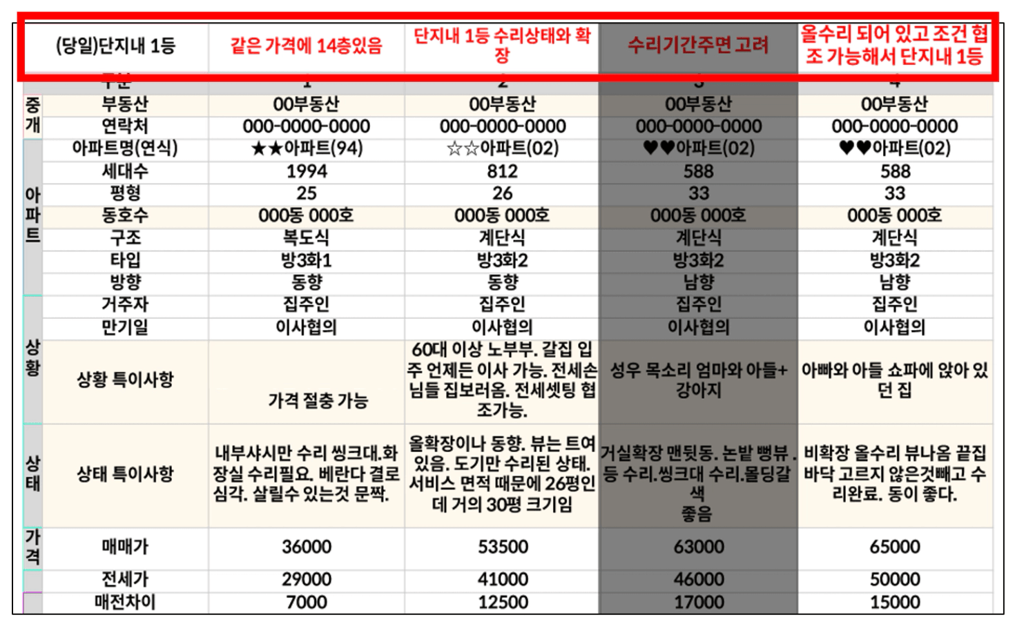 층, 동, 향, 방개수, 수리상태 모두가 다른 상황일 때 비교를 하기 쉽지 않은데요.