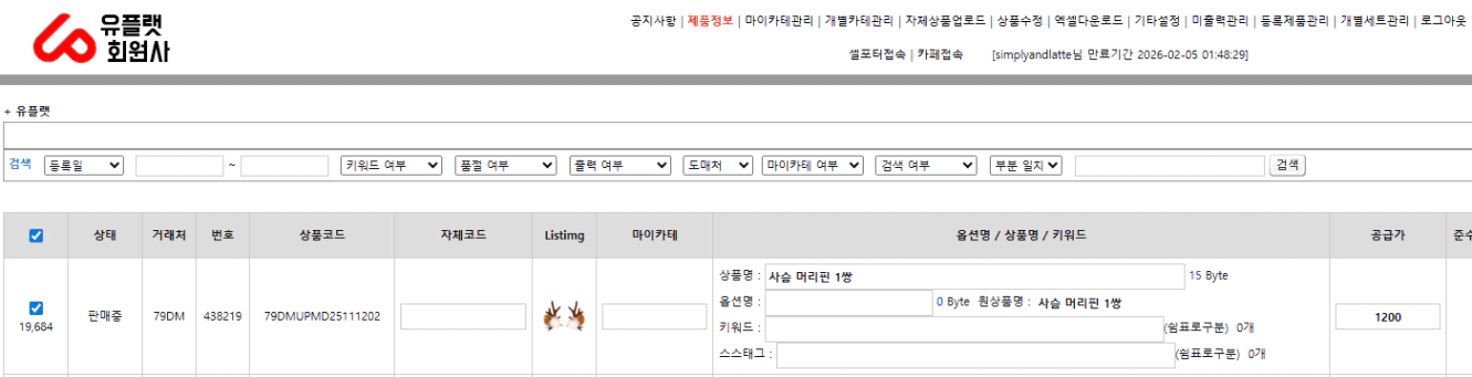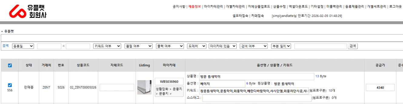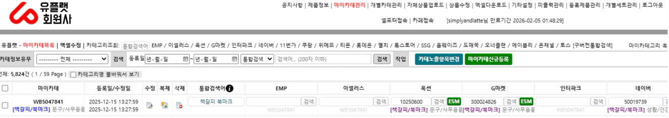 제가 마이카테관리에 있던 리스트를 가공한 엑셀을 업데이트하면 제품정리 → 마이카테 있음으로 검색했을때 나온
