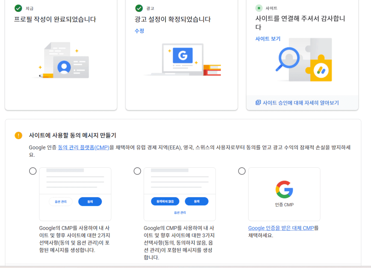 질문 내용:애드센스 승인 재요청을 한 상태인데 아래 화면에서 무엇을 선택해야 할까요?