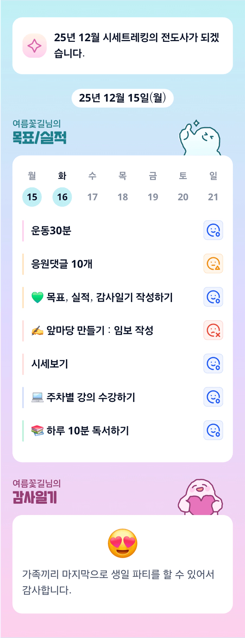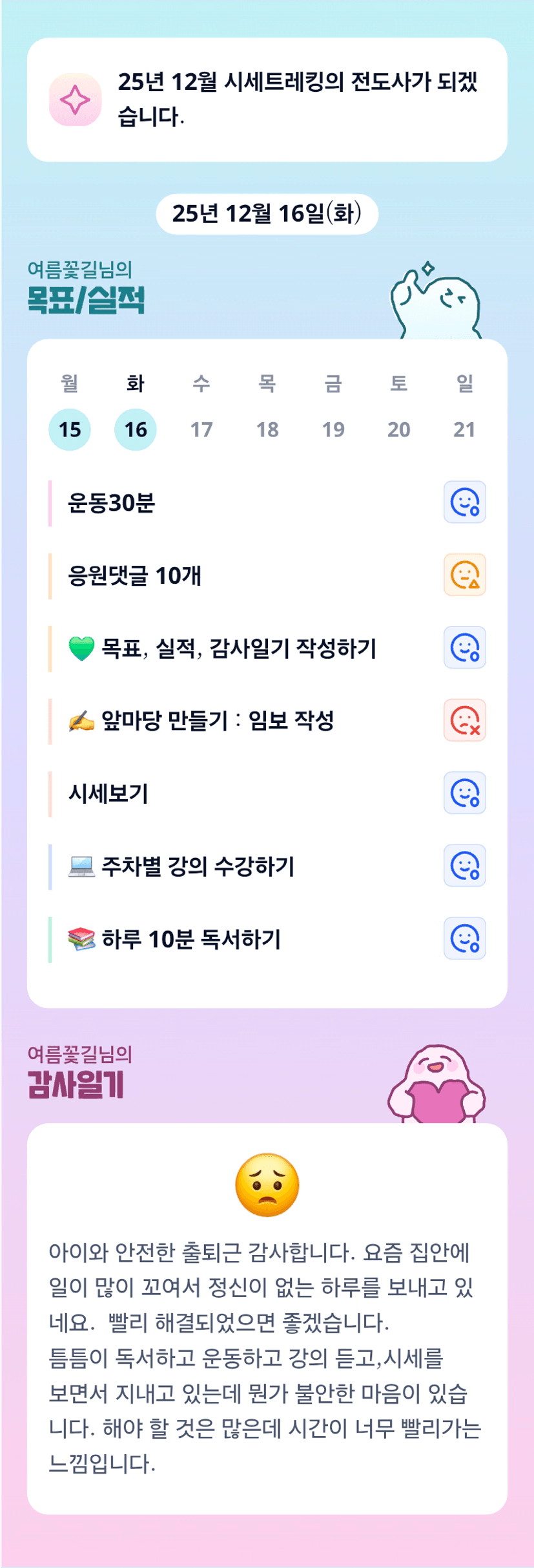 해야 할 것은 정말 많은데 항상 시간은 부족한 것 같아요. 오늘 하루도 수고 하셨습니다. 내일부터는 우리 가장중요하고 시급한 것 부터 한개씩 해치워보시죠. 저도 화이팅 하고 꽃길님도 화이팅 !!
