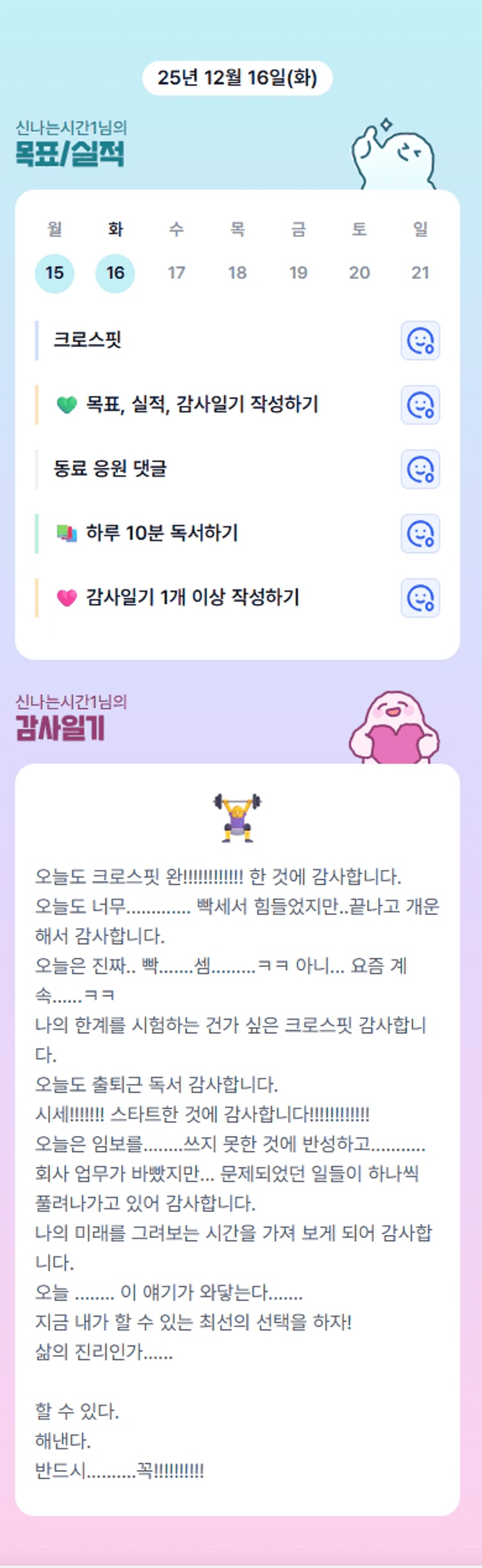 하루 하루를 소중하게 살아내고 계신 시간님 오늘도 운동까지 너무 수고 하셨어요. 항상 컨디션 관리 잘 하시면서 시간님의 북극성을 향해 가열차게 달려가시길 항상 응원합니다 화이팅 !!