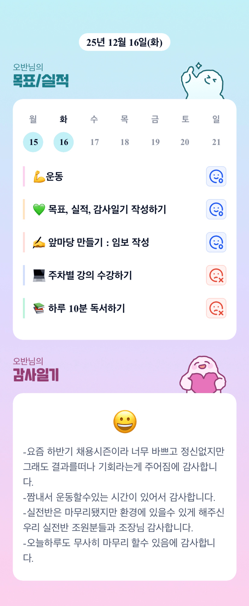 오늘도 반이상 했다님 화이팅입니다.!!들락날락했어도 했음에!! 어제보다 나았음에!! 그냥 징징대고 싶으면 연락 주십쇼!