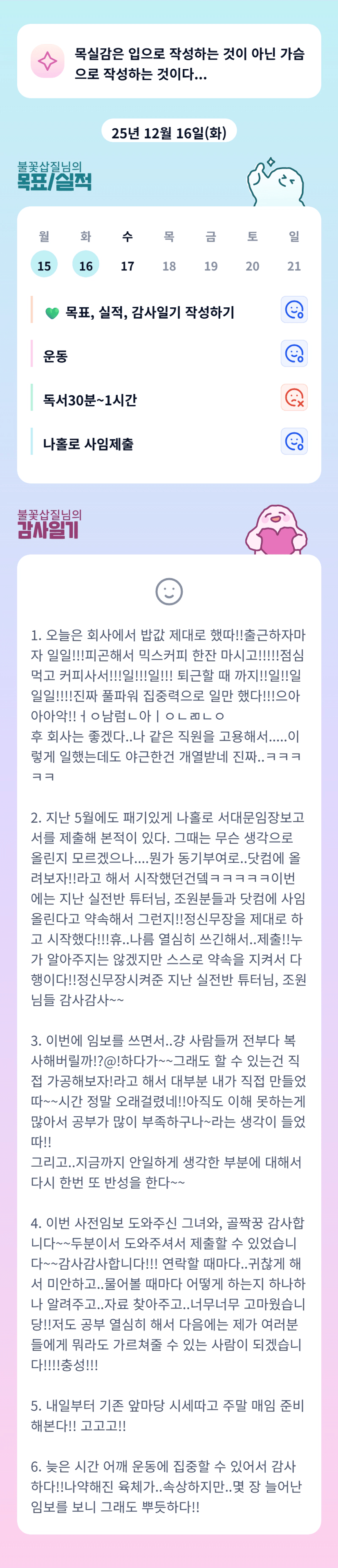 와!!!!! 삽질님 넘 많이 성장하셨네요!!!!! 앞으로도 이렇게 쭉쭉 성장하실 수 있어요!!!!!! 화이화이!!!!!!!!!!! 멋지다!!!!!!!!!!!