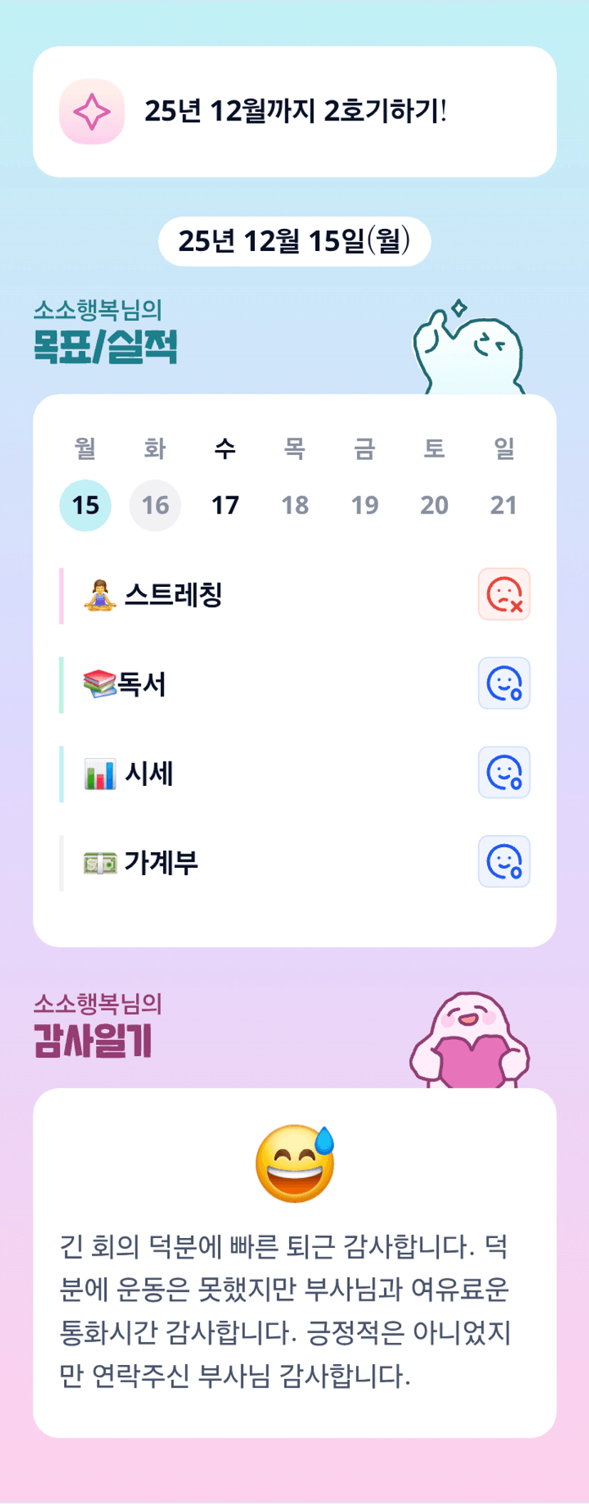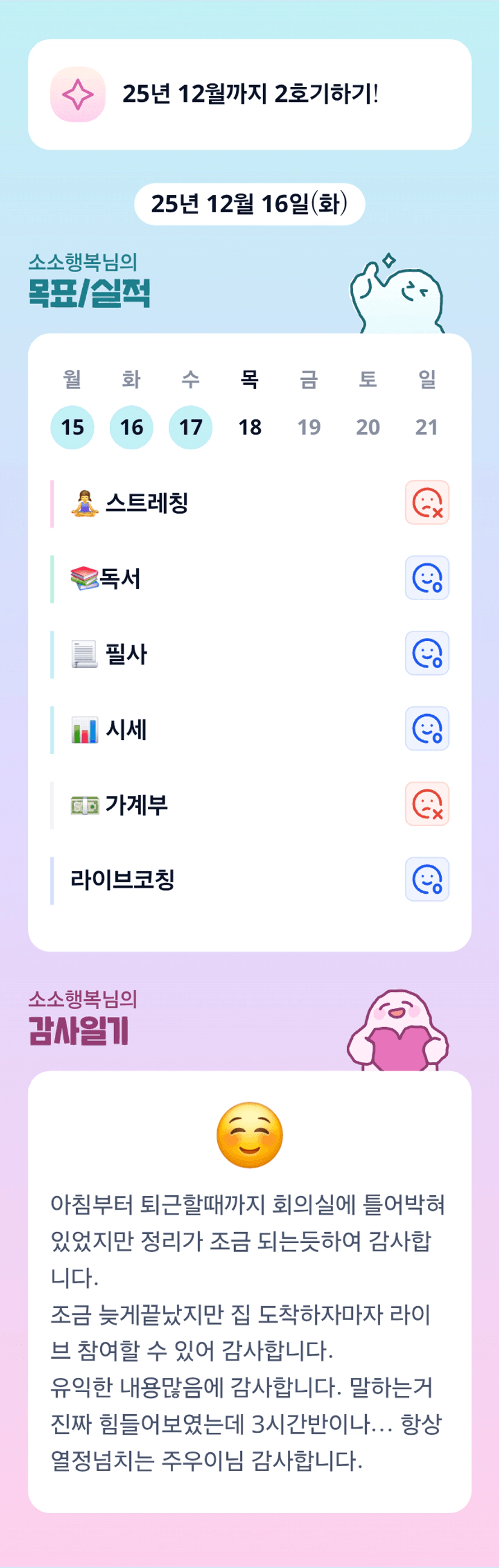 소행님 꾸준한 목실감!! 역시 실행하는 분!!! 고생 많으셨어요:)