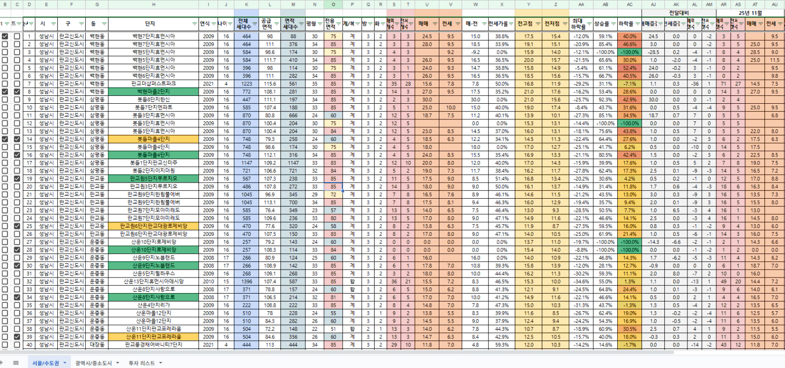 서울수도권, 지방광역시, 그리고 투자 리스트 3개 시트로 나눠서 정리하고 있습니다.