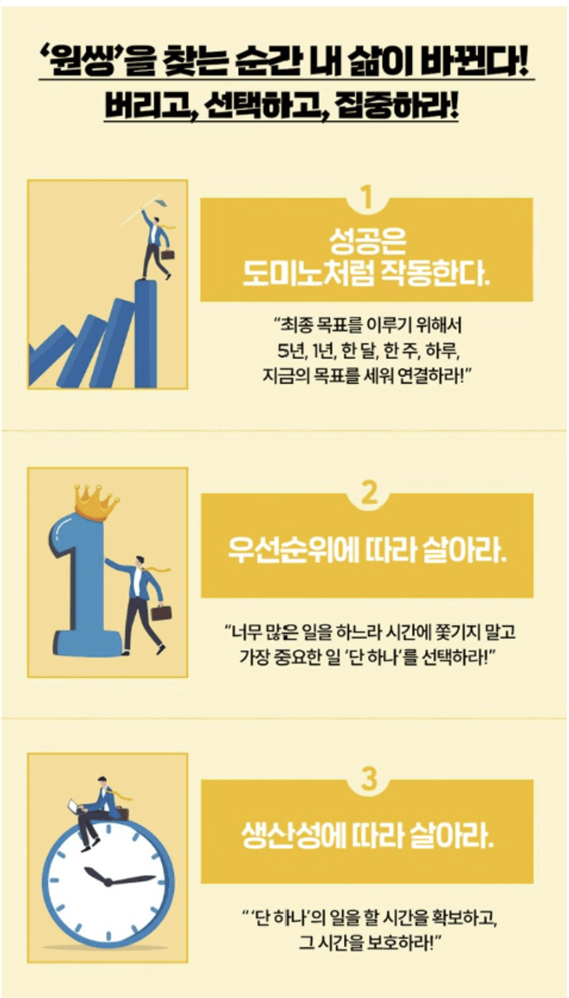 | 한줄평 | 더 많은 것을 해내고 싶다면, 핵심은 더하기가 아닌 빼기다, 언제 읽어도 얻을 구절이 반드시 있는 책 |
