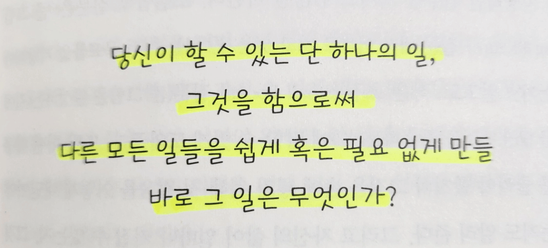 원씽을 하기 위해선 먼저 원씽이 아닌 것들을 추려내는 작업, 즉 빼기가 필요하다는 것이 요즘 더 와닿는 것 같다. 이것도 해야 할 것 같고, 저것도 해야 할 것 같은 느낌이 자주 들지만 그럴 때일수록 '진짜 중요한 본질, 핵심' 즉 원씽을 남기는 작업이 그 여느 때보다 중요해지기 때문이다.