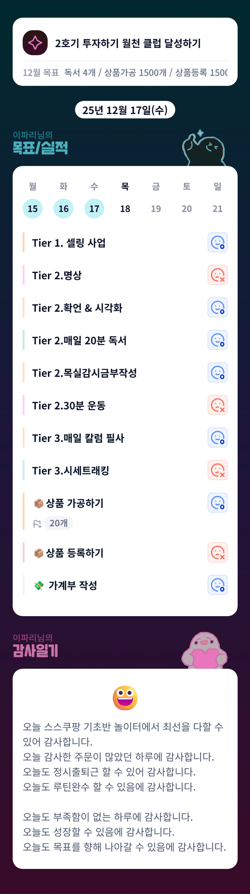 이파리님 오늘도 꾸준한 루틴! 열심히 수강하고 계시군요🥰 추운 날씨에 건강 챙기시면서 화이팅입니다!