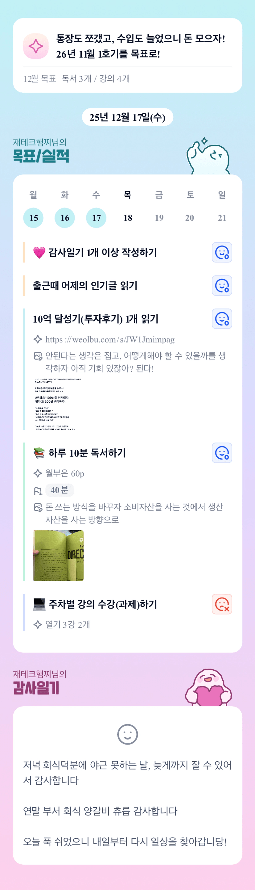 양갈비 저도 좀.....ㅋㅋㅋ 독서와 10억달성기 도전 멋지십니다!! 다음번에 읽는 것에 그치치 않고 필사도 도전해보세요!