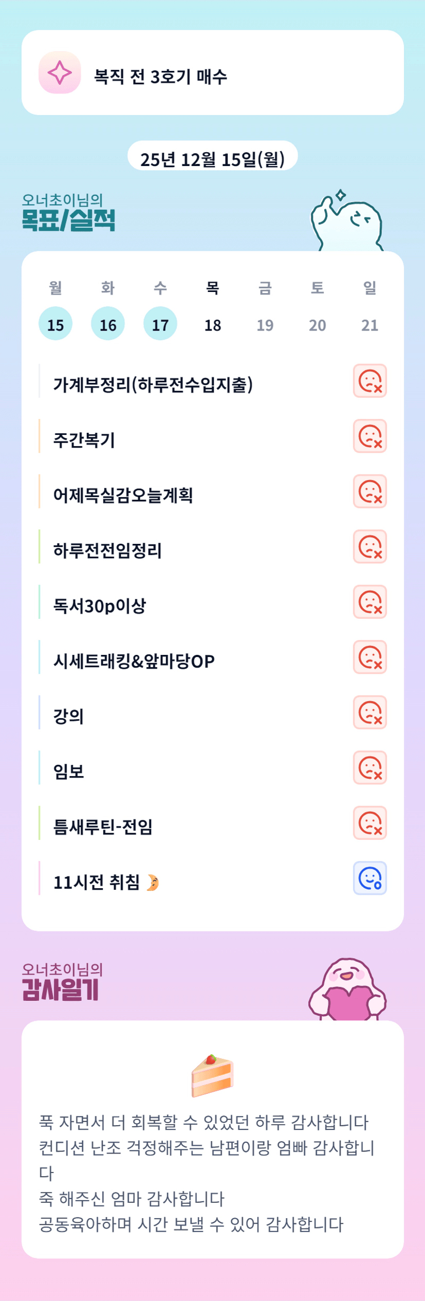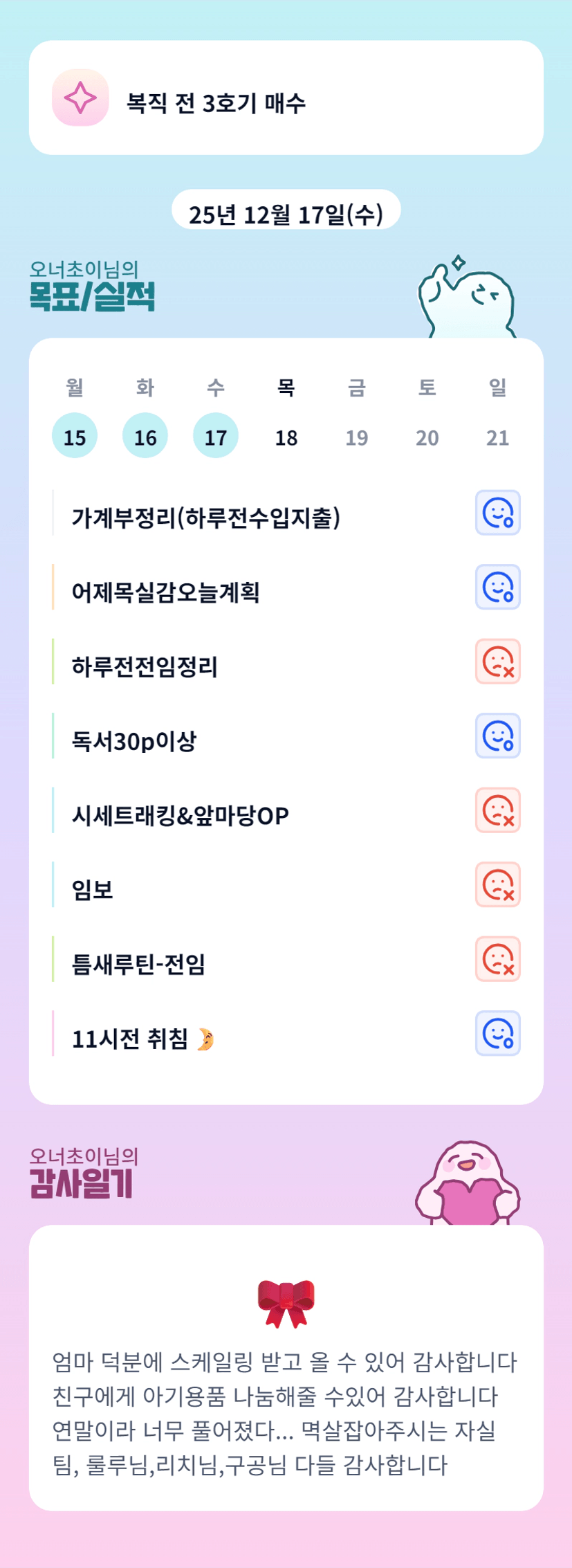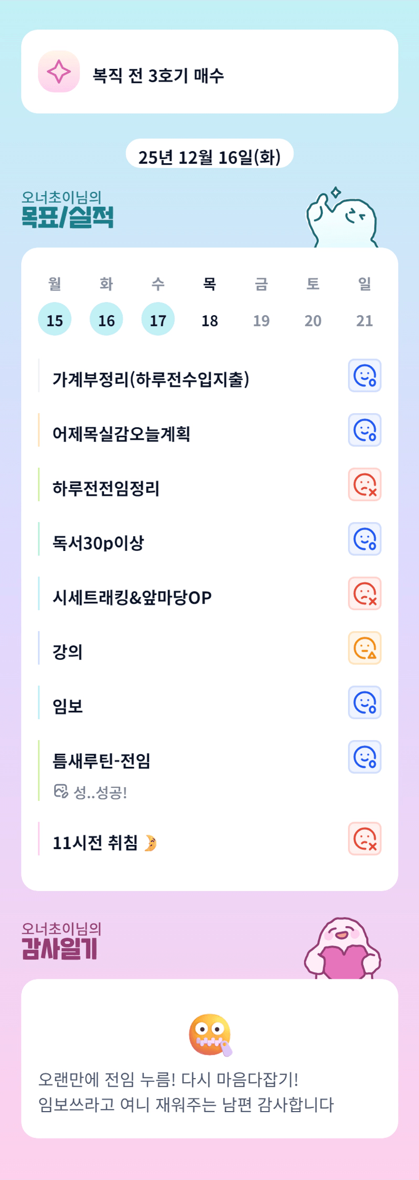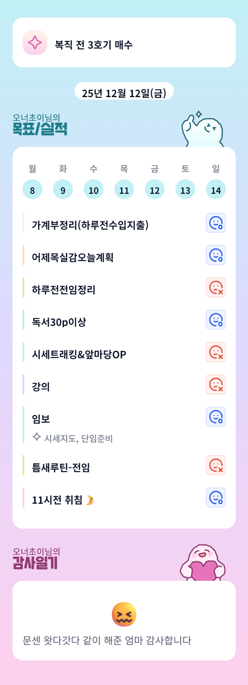 꽤 여러가지 일들이 있으셨군요 어디 아프기도 하셨나봐요ㅠ 복직전 3호기 꼭 달성 초이님이라면 해낼수 있어요👍👍