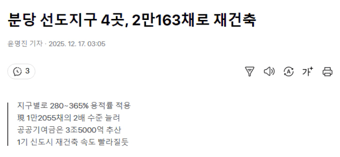 그러나 세월 앞에 장사 없듯 아이들이 커가면서 아파트가 낡아지기 시작했고, 그 안에 사람들이 모여살고자 하는 의지는 강하나 아파트 자체가 낡아짐에 따라서 거주만족도가 떨어지기 시작했습니다. 그러다 나라에서 “비교적 빠르게” 아파트 재건축을 실시해주는 <선도지구> 제도가 생겼고, 바로 어제 분당에서 재건축 소식이 들렸습니다.