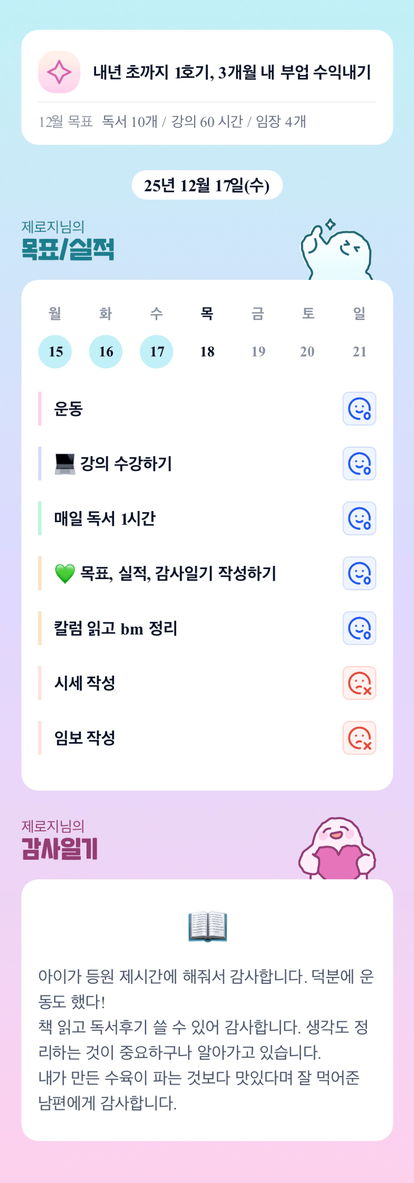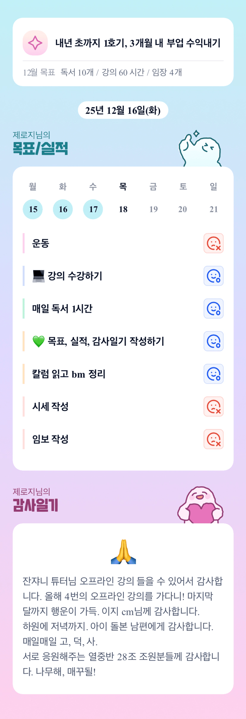 오프라인 4번이나! 그만큼 열심히 했다는 증거이겠죠 제로님~ 운동도 하고 책도 읽고 강의도 듣고 매일매일 성실하게 열심히 살아가는 제로님을 알게되어 너무 좋습니다!