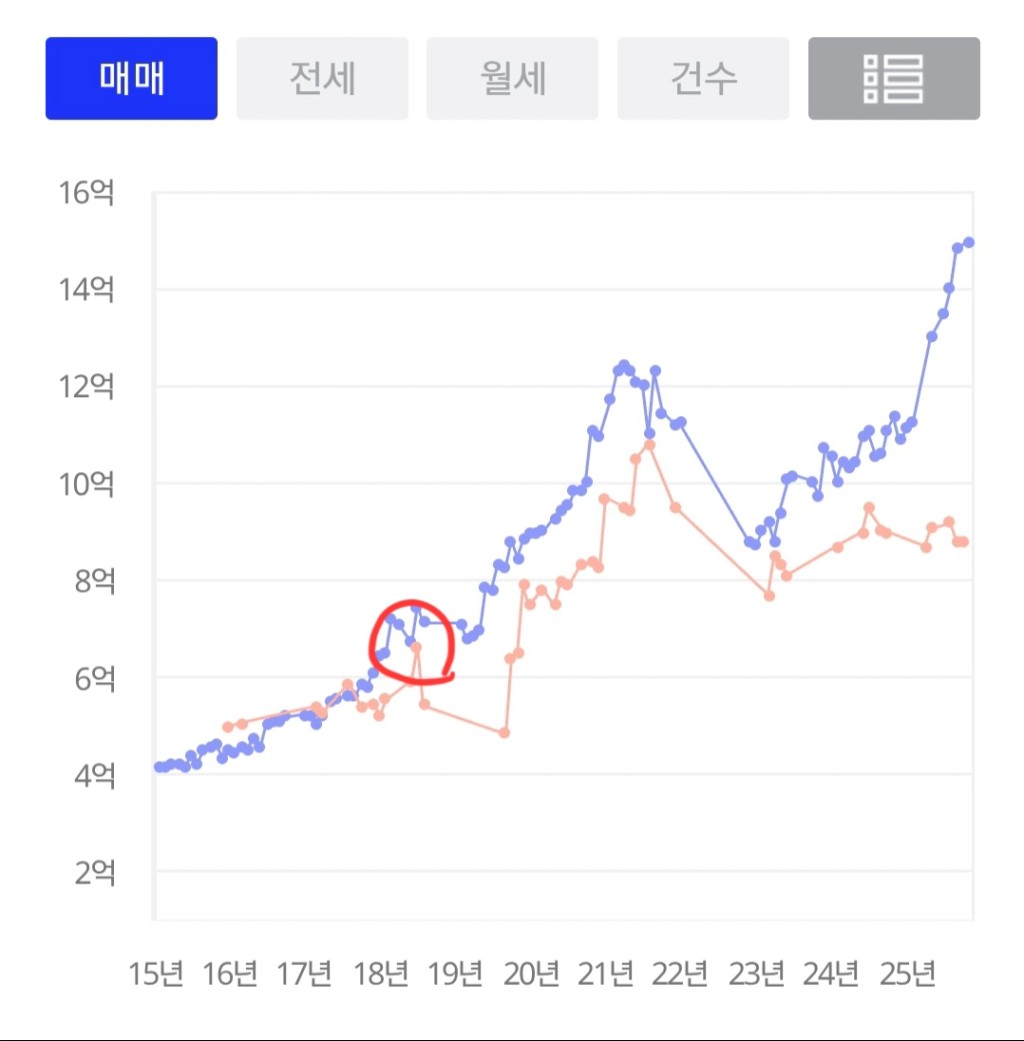 지금 가격을 비교해보면 해당 단지는 전고를 넘어갔고, 제가 실거주로 마련 했던 단지는 아직 가격 회복을 못하고 있습니다.